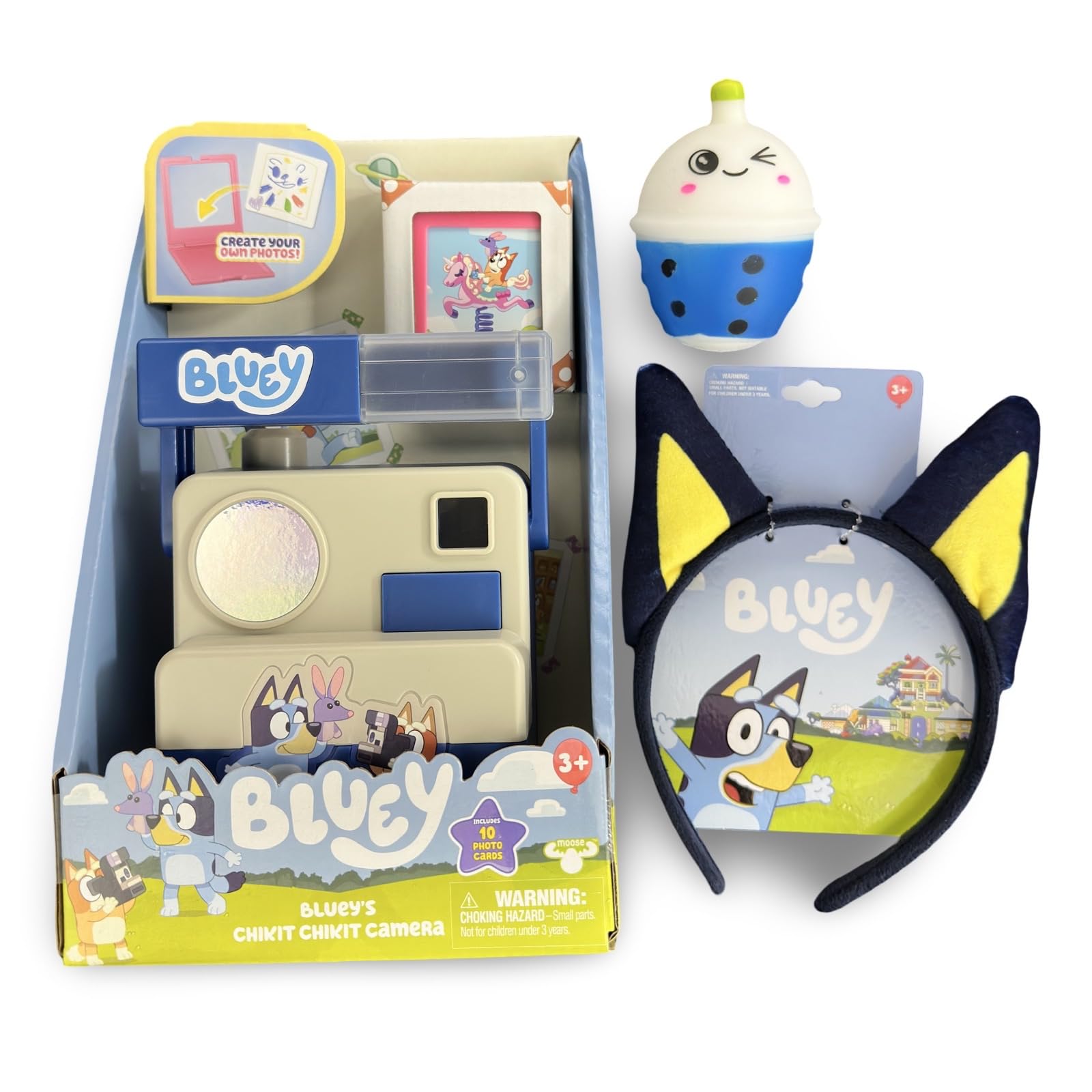 Bluey Chikit Chikit Pretend Camera Toy Set with Photo Cards, Bluey Headband, Cute Squishy Toy for Kids Ages 3+, Blue and Cream, Role Play Activity Bundled Gift Set